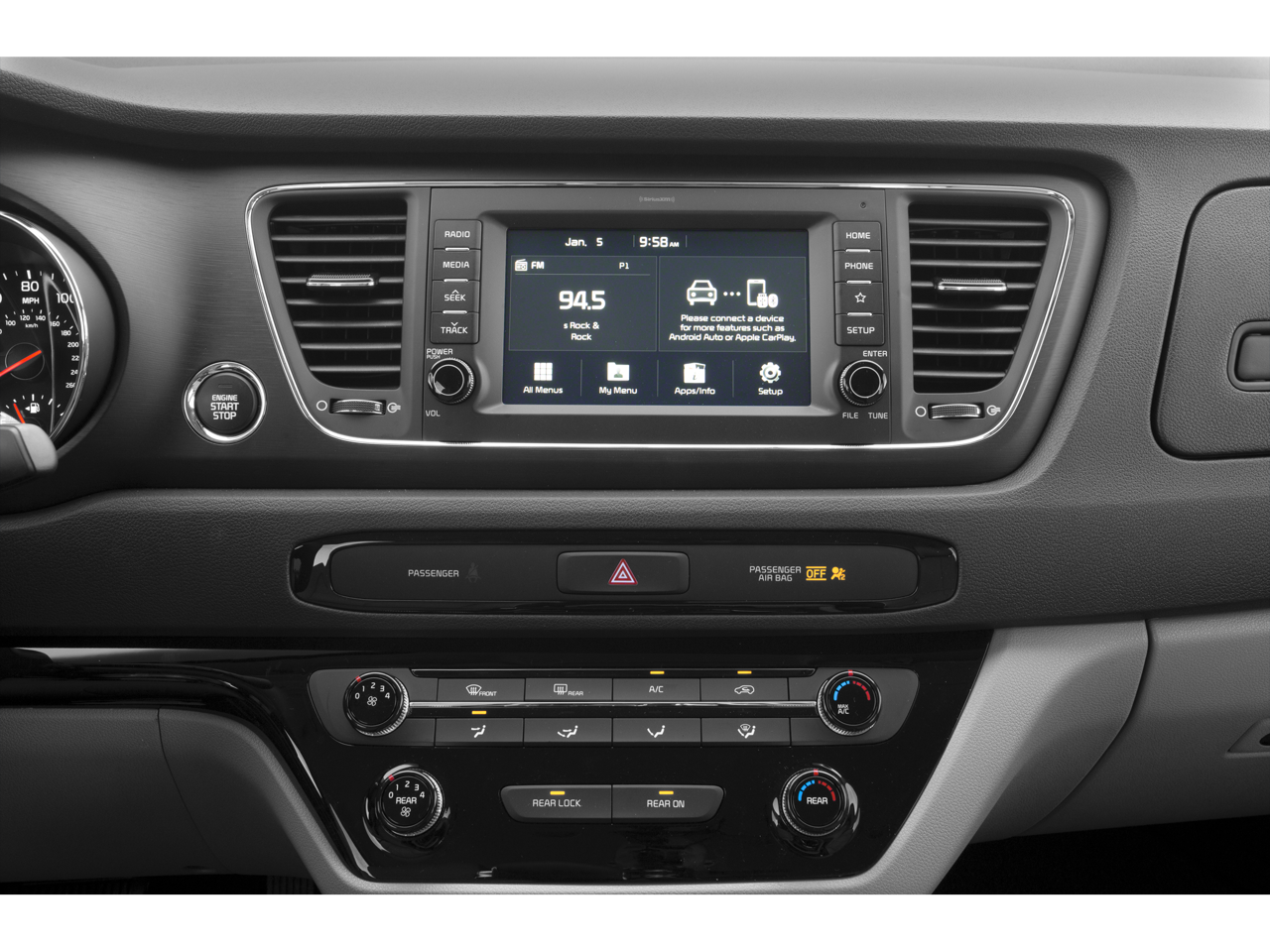 - Radio: AM/FM Audio System -inc: 6 speakers, 7.0" display UVO3, SIRIUS, Android Auto and Apple CarPlay, rear camera display, TMU, USB/auxiliary input jacks and front row and back of center console rapid charging USB